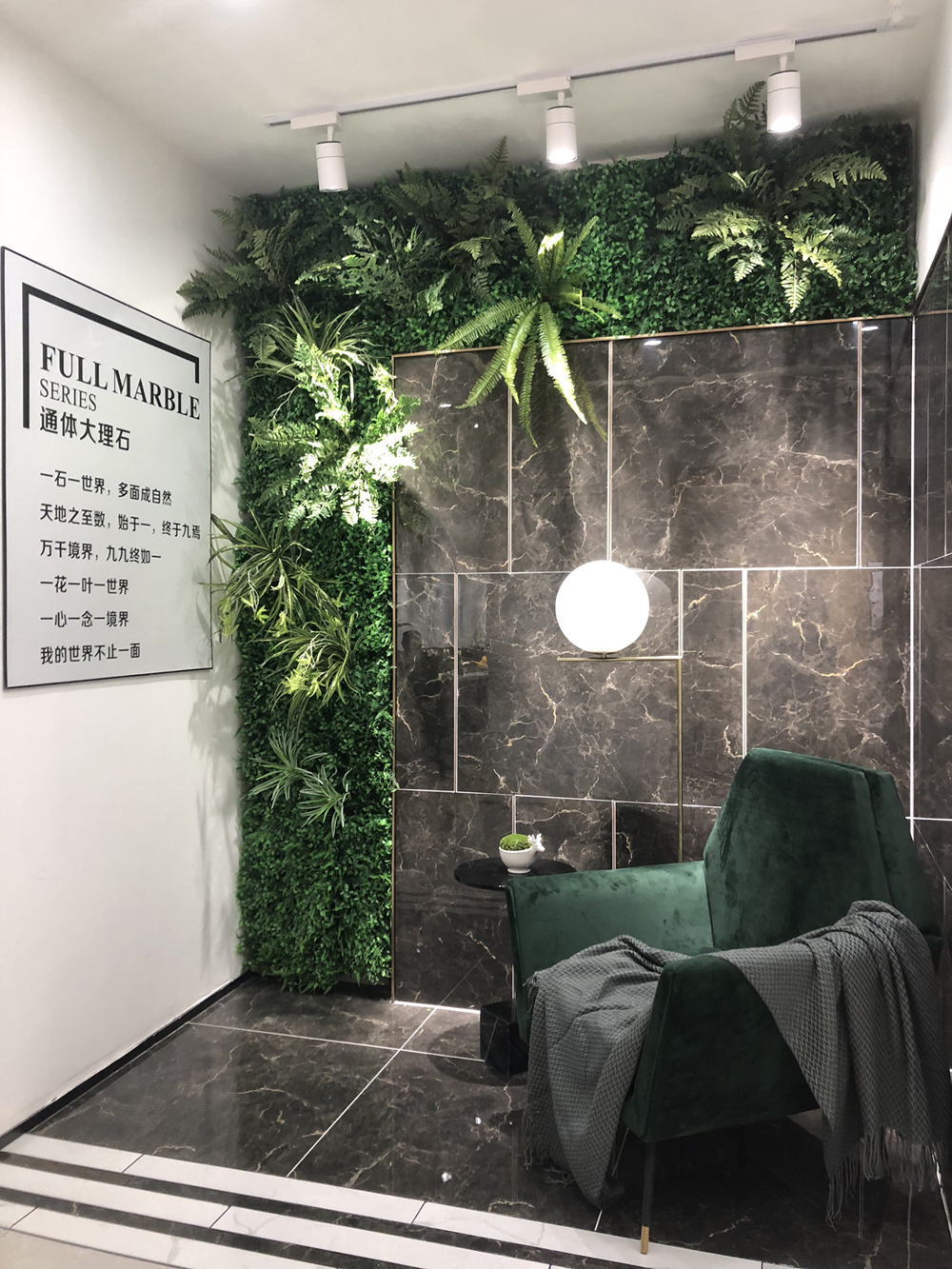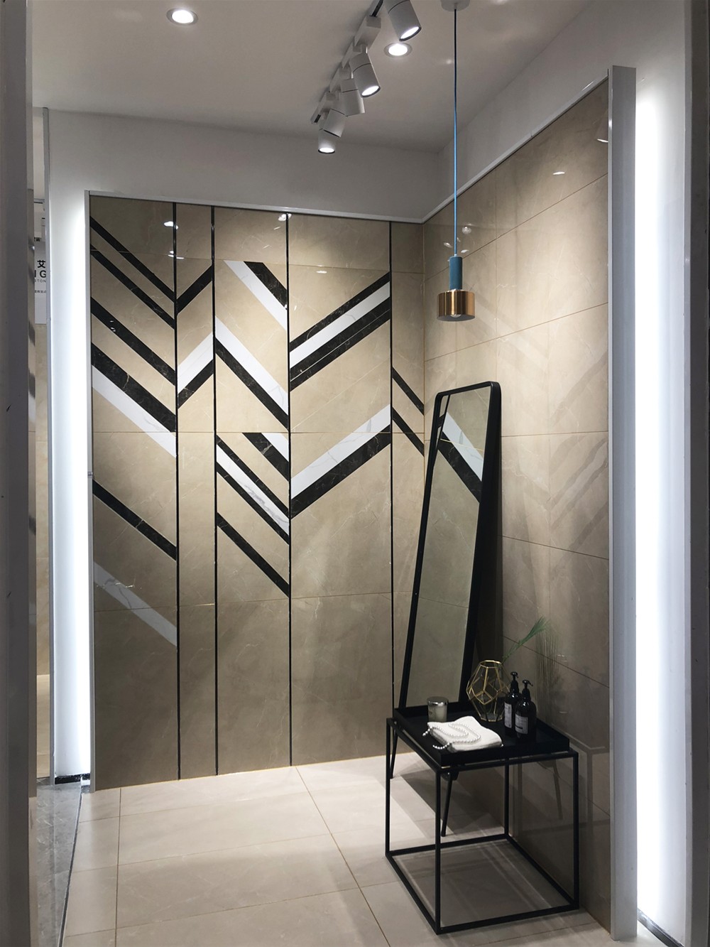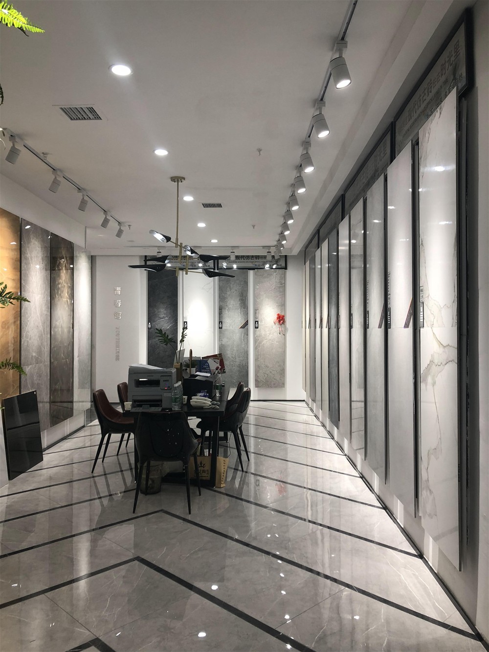这是大板的选材区,选用打竖的陈列方式,射灯照射下的产品,干净、整洁、大气、直观。