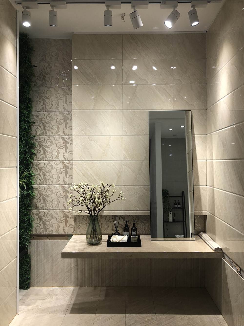 墙面可作沙发背景墙、电视背景墙、厨卫墙面和客厅地砖使用。亮面砖很好地提亮整个空间的光感。