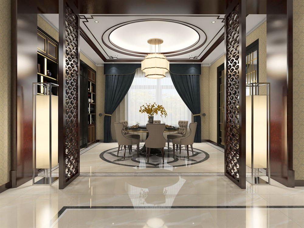 餐厅作为和客厅贯通的空间,利用相协调的深木色酒柜为整墙背景,选择富有中式格调的地砖拼花,象形荷花图案,整体空间呈现素雅而明媚,传统而不失现代,慢慢生出了整个空间的“魂”。让人觉得在此用餐是为乐事!