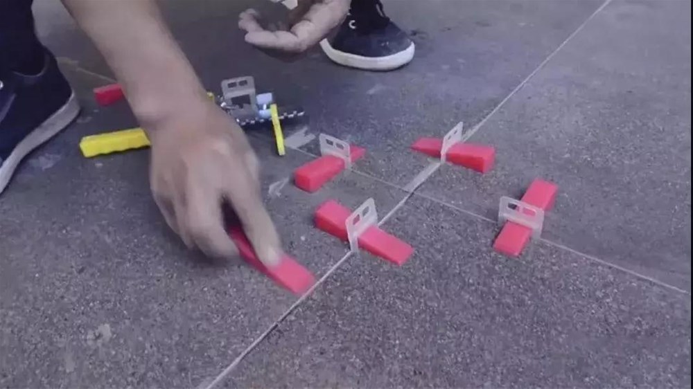 在已定位好的大板边缘周围每60cm左右插入找平器底座,检验平整后插入找平楔子并夹紧找平器,调节相邻大板的表面平整度,并将大板间隙调整为2mm左右,以便后续美缝剂处理。