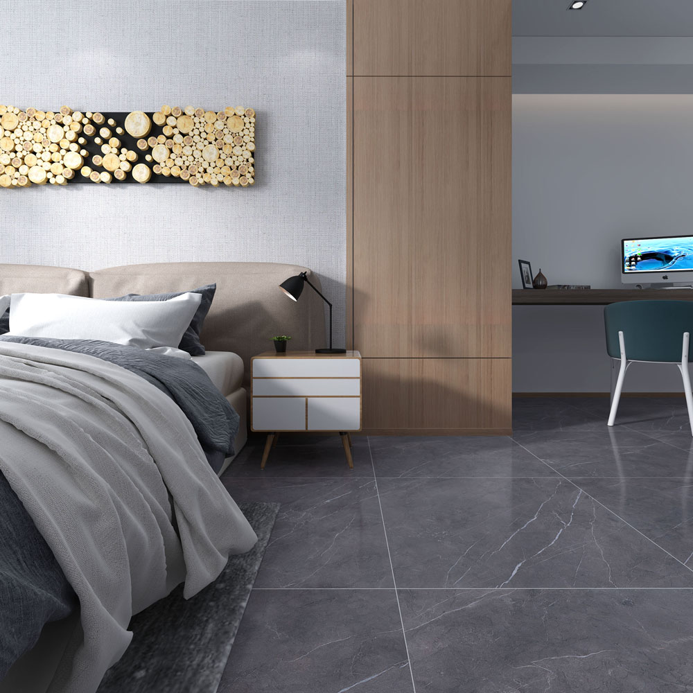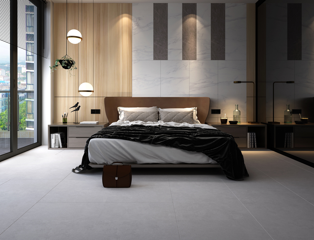 (15°缎光釉KFD8808)主卧室依然延续冷淡的灰色基调,以简洁舒适为主,营造出安静舒心的睡眠环境。