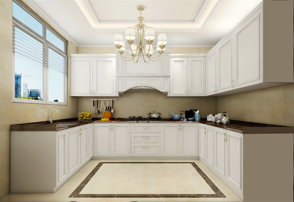 厨房体现简欧最为明显的就是整套橱柜,白色的橱柜摒弃繁杂的雕刻工艺,呈现简约大气的品味,橱柜表面深褐色的大理石台面,时尚整洁又耐脏;U型厨房看起来也格外宽敞,设计师巧妙地把灶台和洗菜盆两个区域区分开,让主人用起来舒心方便。地砖采用15°缎光釉瓷砖,能上墙下地,米黄色温馨又高雅,波打线与橱柜台面颜色一致,呈现空间的和谐统一。