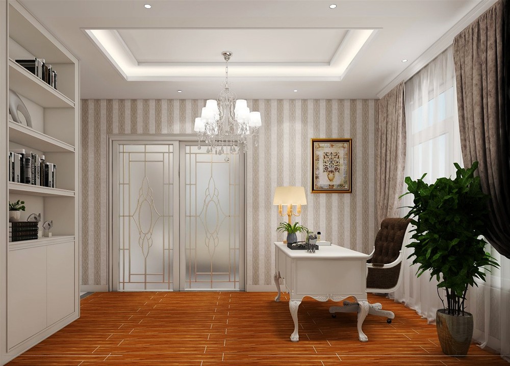 不同于中式风格的优雅含蓄,简欧书房多给人轻柔高雅之感。例如白色的书桌与书柜相配,又或是大气高贵的窗帘帘幔,连墙纸上精细花纹,也让人觉得欣喜。深木色的地板与绿植,让整个空间的色调丰富了许多。