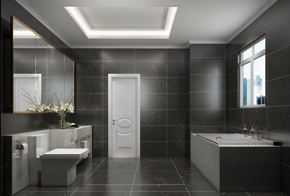 卫生间是一个比较私密性的空间,设计师采用深灰色的15°缎光釉铺贴,简单的铺设演绎出现代欧式空间的简约大方之美,白色简单雕塑的门、浴室柜、天花板等给空间适当地留白,提亮了整个空间。